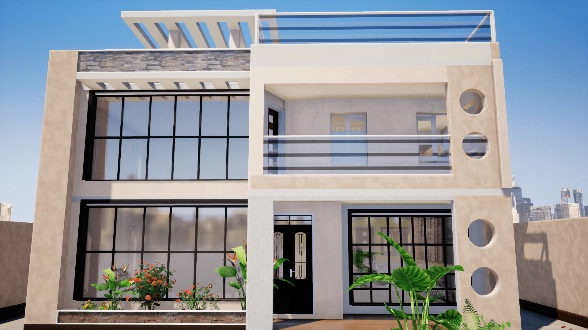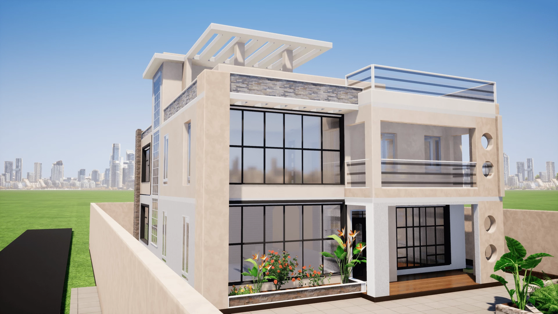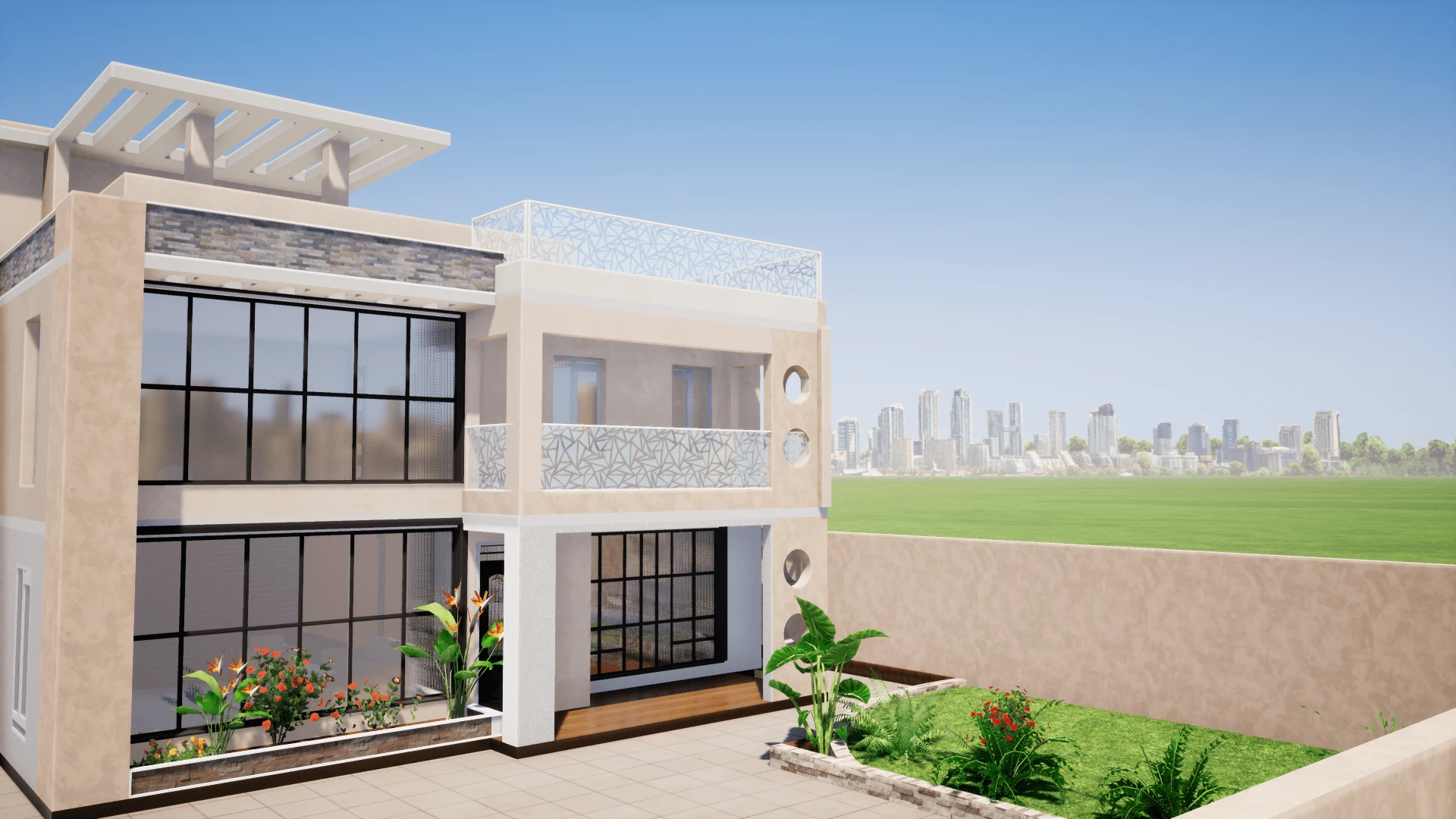 on the top floor, we have pergolas on the back and the front. A laundry area and an entertainment room with extreme open windows and sliding doors extending to open terrace.
